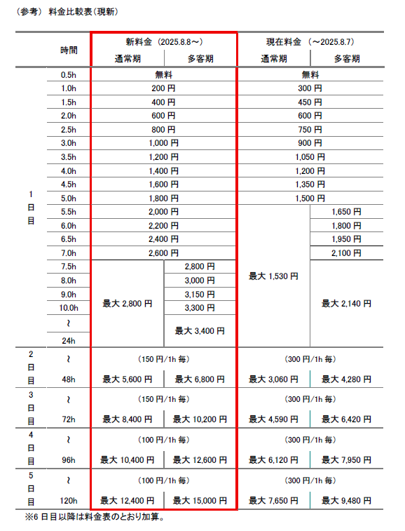 - ・例えば、1時間~8時間は「30分ごと150円」から「30分ごと200円」に変更されています
