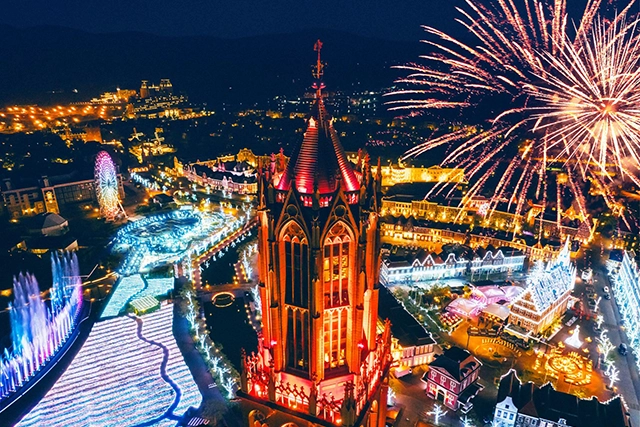 日本最大級のイルミネーション、1,300万球もの光が輝いています。年中楽しめる日本初3階建てのメリーゴーランド、スカイカルーセルや光の観覧車はとても幻想的です。季節限定のプロジェクションマッピングや花火との競演も大人気です。